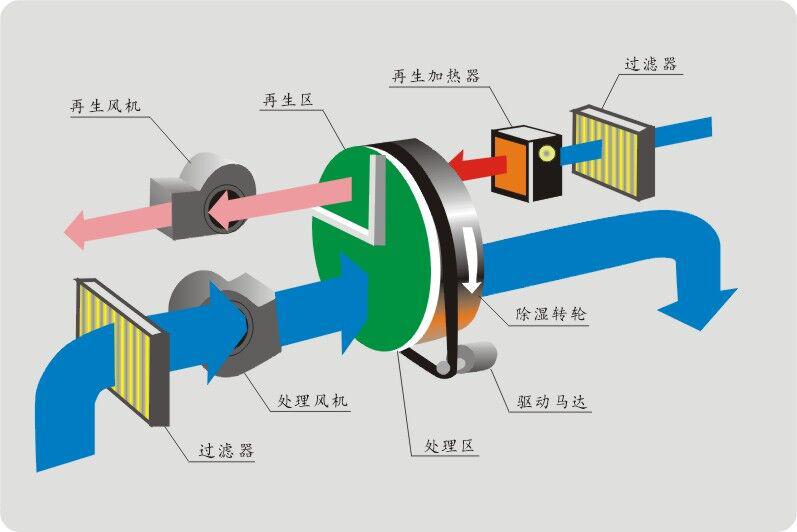 采用瑞典/美國原裝蜂巢式硅膠除濕轉(zhuǎn)輪,以蜂巢結(jié)構(gòu)組成圓筒狀轉(zhuǎn)盤,再由陶瓷矽膠結(jié)晶燒成除濕區(qū)和再生區(qū)的箱體內(nèi)回轉(zhuǎn),除濕用的空氣通過除濕區(qū),由轉(zhuǎn)輪吸收空氣中的水份,而得到干燥的空氣。