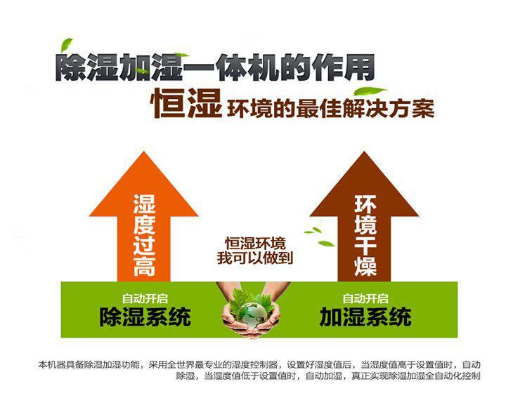 ◎除濕加濕一體機的作用:一臺機器具備除濕功能、加濕功能,設(shè)置好濕度,當(dāng)房間濕度值高于設(shè)置的濕度值時,電腦板控制系統(tǒng)會起動機器除濕功能模塊來進行除濕,除濕的水經(jīng)排水管自動排出,達到設(shè)定的濕度值時會自動停機;當(dāng)干燥天氣,設(shè)定的濕度值低于濕度值時,電腦板控制系統(tǒng)會起動機器加濕功能模塊來進行加濕,加濕的水源需連接到機器上,為DN25進水管,達到設(shè)定的濕度值時會自動停機;